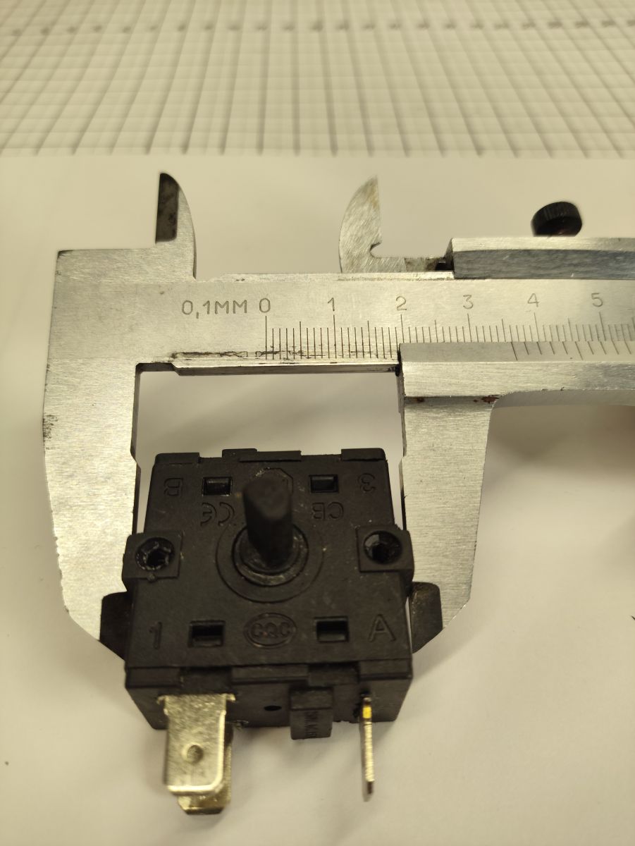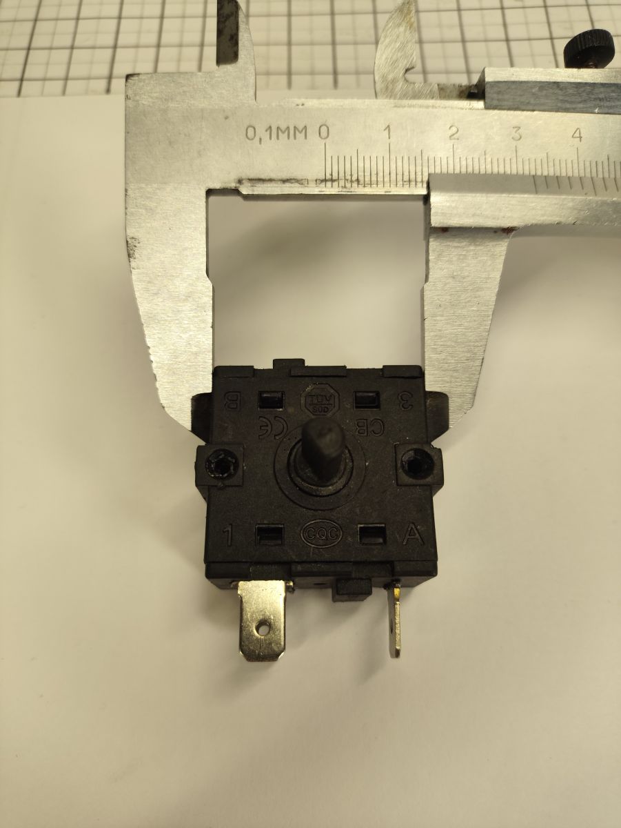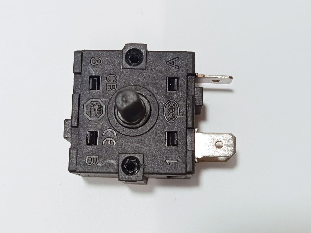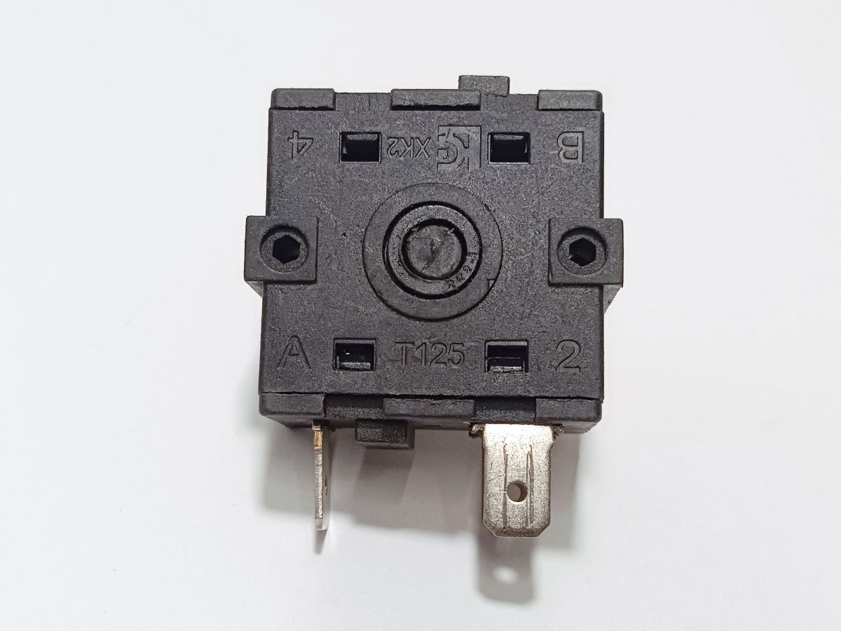 Переключатель поворотный 3-х позиционный (2 рабочих позиции + 0 нулевая). Имеет 3 электрических контакта. Маркировка контактов: "B", "3", "4". Допустимое напряжение 250 V (Вольт), максимальный рабочий ток 16 A (Ампер). Контакты могут быть в зеркальном отражении.